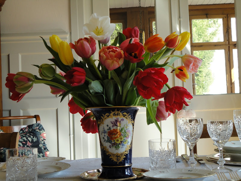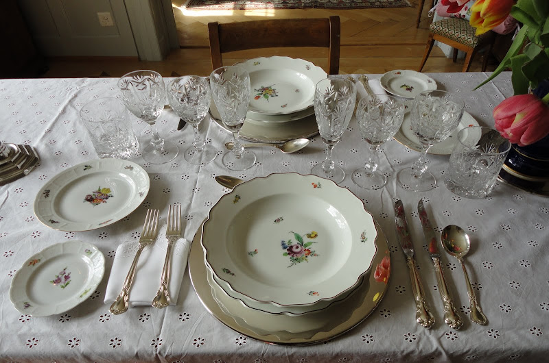Ohhh my…Cornelia's table is simply gorgeous!!! How I wished to be a quest at her lovely table…not to mention…be in Switzerland!!! The china is exquisite…I love that each piece have different hand painted flowers on them…that's awesome! The crystal stemware is just "out of this world" beautiful! Ohhh…and I love, love, LOVE that Meissen vase full of those vibrant colored tulips…ahhhh!!!