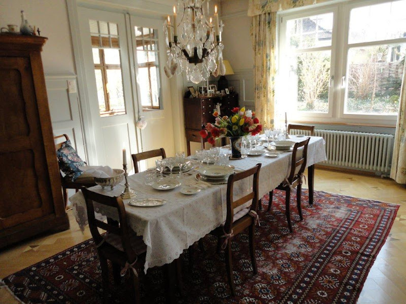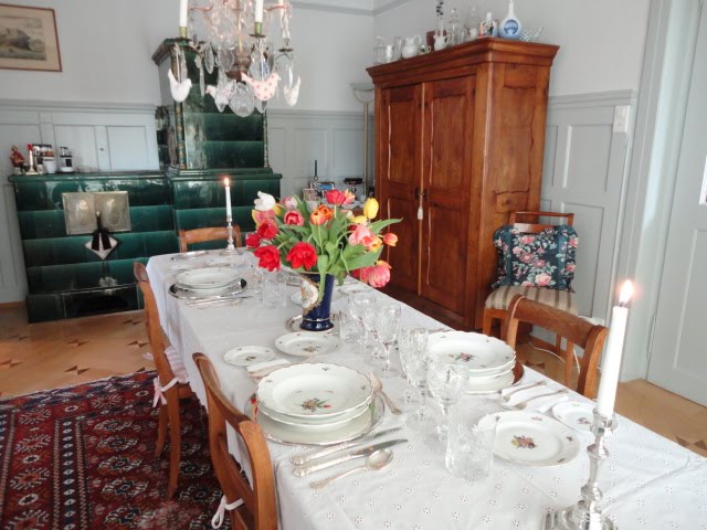 I have always dreamed of visiting beautiful Switzerland. This is a special treat to visit Cornelia's lovely dining room. Delicate and beautifully presented, and "yes" I love the Meissen vase. Love it all!