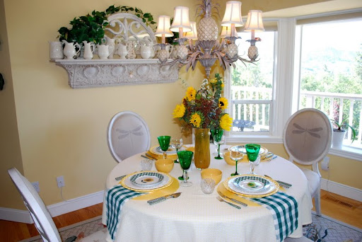 Love the two tables. The pineapple chandelier is perfect. I love the green glasses on both tables as well. I appreciate your list of where items were purchased. It helps if there is something specific someone wants to purchase.