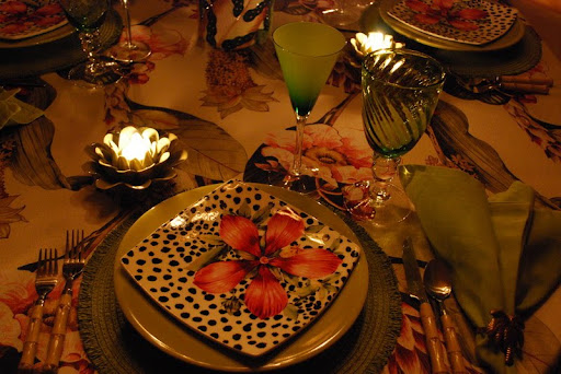 Wow! Bonnie's second tablescape is so fab! I am sure the dining experience is superb — like eating in the middle of a tropical rain forest (without the bugs!). Gorgeous!