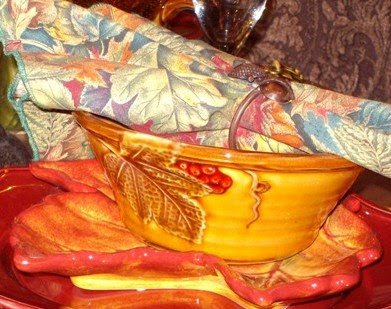 “As the leaves change outside, so does the decor inside our home. The house fills with the scent of mulled cider and the deep reds and greens turn to burnt oranges and browns. That means I get to take out the fall dishes…now herein lies the problem…because until a month ago, I didn’t really have any what you would classify as “fall dishes”. I have several sets for the other seasons, but not one fall set. So I go out scouting, and lo and behold, a stop at T.J.Maxx provided just the right set…the perfect brown with a wonderful leaf and a red berry on them. Once I saw the red berry I knew they would work with an existing set of red dishes I already had.