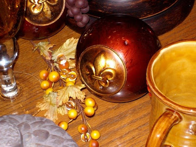 What a beautiful tablescape Lynne put together! I love all the golds and reds! Just DREAMY! (And that fleur-de-lis carpet ball really caught my eye! :-)) Thanks Lynne for sharing the process of how you put it all together.